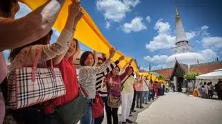 El calendario marca en rojo fuerte la página de abril para los tailandeses. Es el momento de recibir al nuevo año y festejarlo por todo lo alto. Si está usted en Tailandia en esas fechas, cómprese una camiseta de flores, verde, naranja o azul, al estilo hawaiano, hágase con unas pistolas de agua, o mejor, con un fusil de doble carga, colóquese unas gafas protectoras para los ojos y láncese a la calle. Le espera la más divertida guerra de agua que pueda imaginar. Hay que batallar sin perder la guardia, aunque, a pesar de su destreza, acabará empapado, seguro. No importa, se agradece, el calor aprieta y la pelea es tan festiva como la de nuestra tomatina. Al unísono y a solo unos metros, en los templos thais, purificados y decorados para la ocasión, se realizan sentidas ofrendas a los monjes.